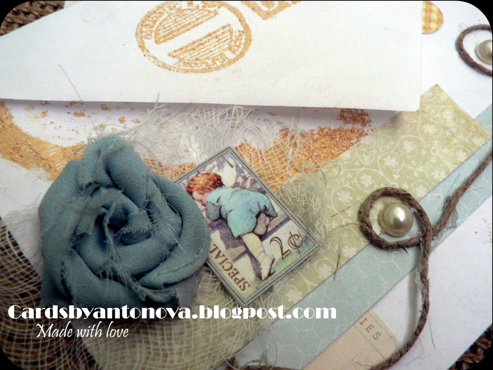 Украшения: бумажные цветы, медная металлическая подвеска, винтажная метал.пуговица, шебби-лента. Также использованы штампы Viva decor, Prima. Надпись сделана вручную.