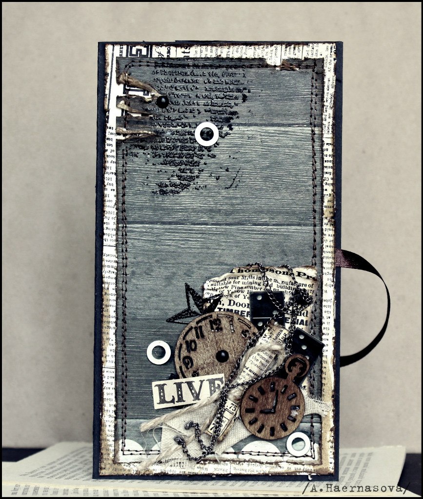 Мне понадобились следующие материалы: Двусторонний лист бумаги Bo Bunny - C'est La Vie - Domino, Двусторонний лист бумаги My Mind's Eye - Miss Caroline - Dilly Dally - Hello Border, черный картон, Вырубки из фанеры Prima - Laser Cut Wood Icons In A Box - Typewriters/Clocks, Набор фотополимерных штампов Lily Bee - Picket Fence Acrylic Stamps, Жидкие чернила Ranger - Distress Stain Brushed Corduroy, пудра для эмбоссинга, Штемпельная подушка Tim Holtz Distress Ink Pad - Black Soot , а так же цепочки, джут, брадс.