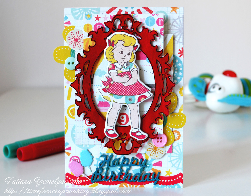 Я решила сделать открытку в ярком американском стиле. Для этого я использовала листы бумаги MME, наклейки MME, брадсы Eyelet Outlet, чипборд Echo Park и Imaginarium Designs. Овальная рамка вырезана на плоттере и покрашена акриловой краской, по контуру обведена маркером Faber-Castell