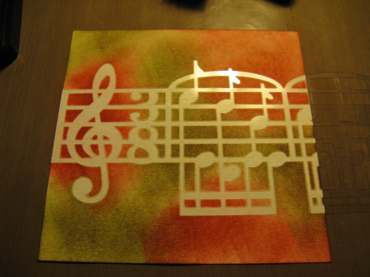 Затем можно сделать фон еще более насыщенным, наштамповав поверху ноты помельче. Здесь использован мини-штамп Prima.