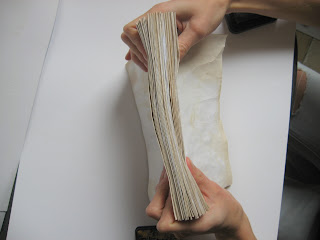 Перед нами прокрашенные в кофе, высушенные и выглаженные странички для будущих блокнотов. Перед тем как их тонировать, ставим подготовленный блок бумаги на ребро.